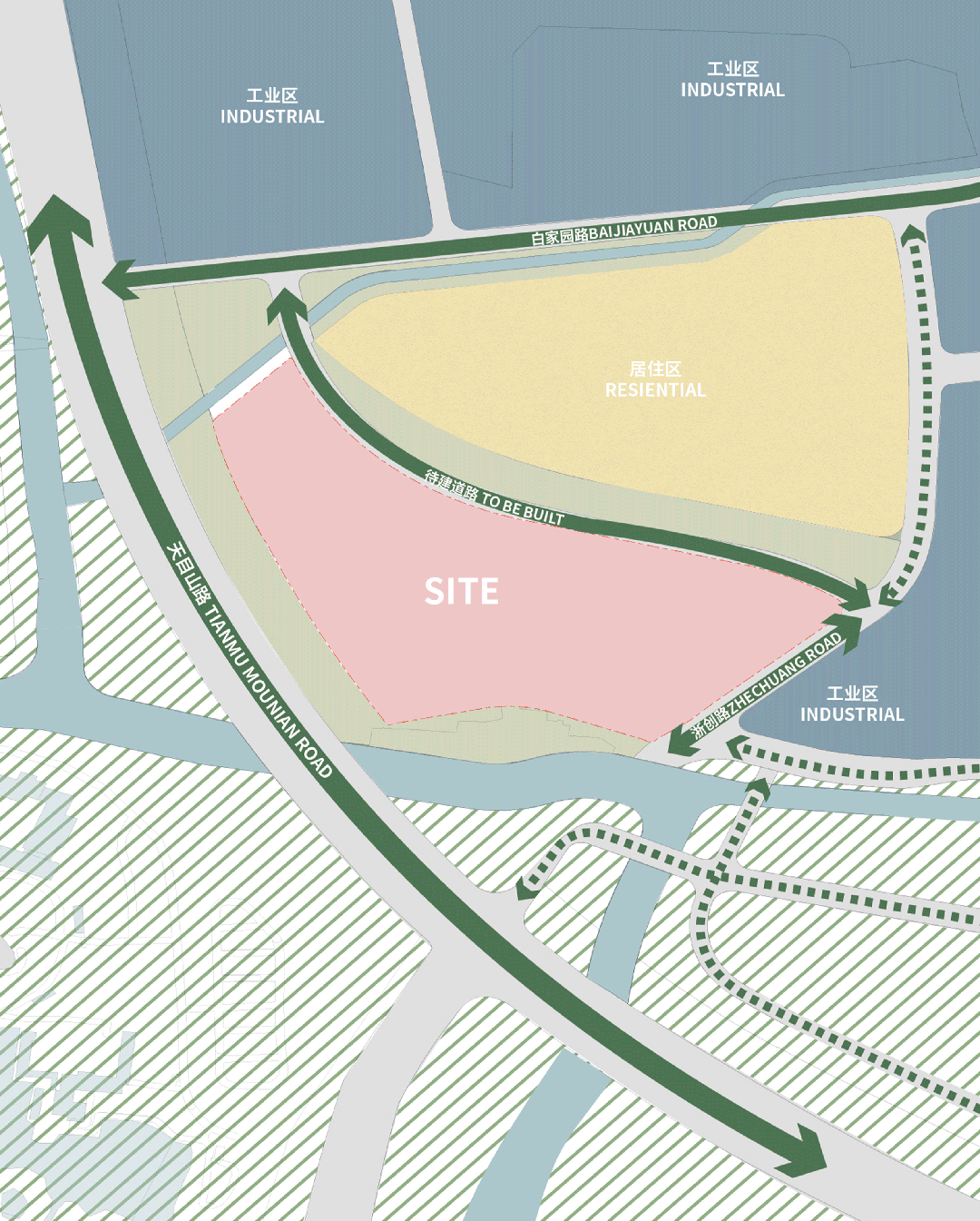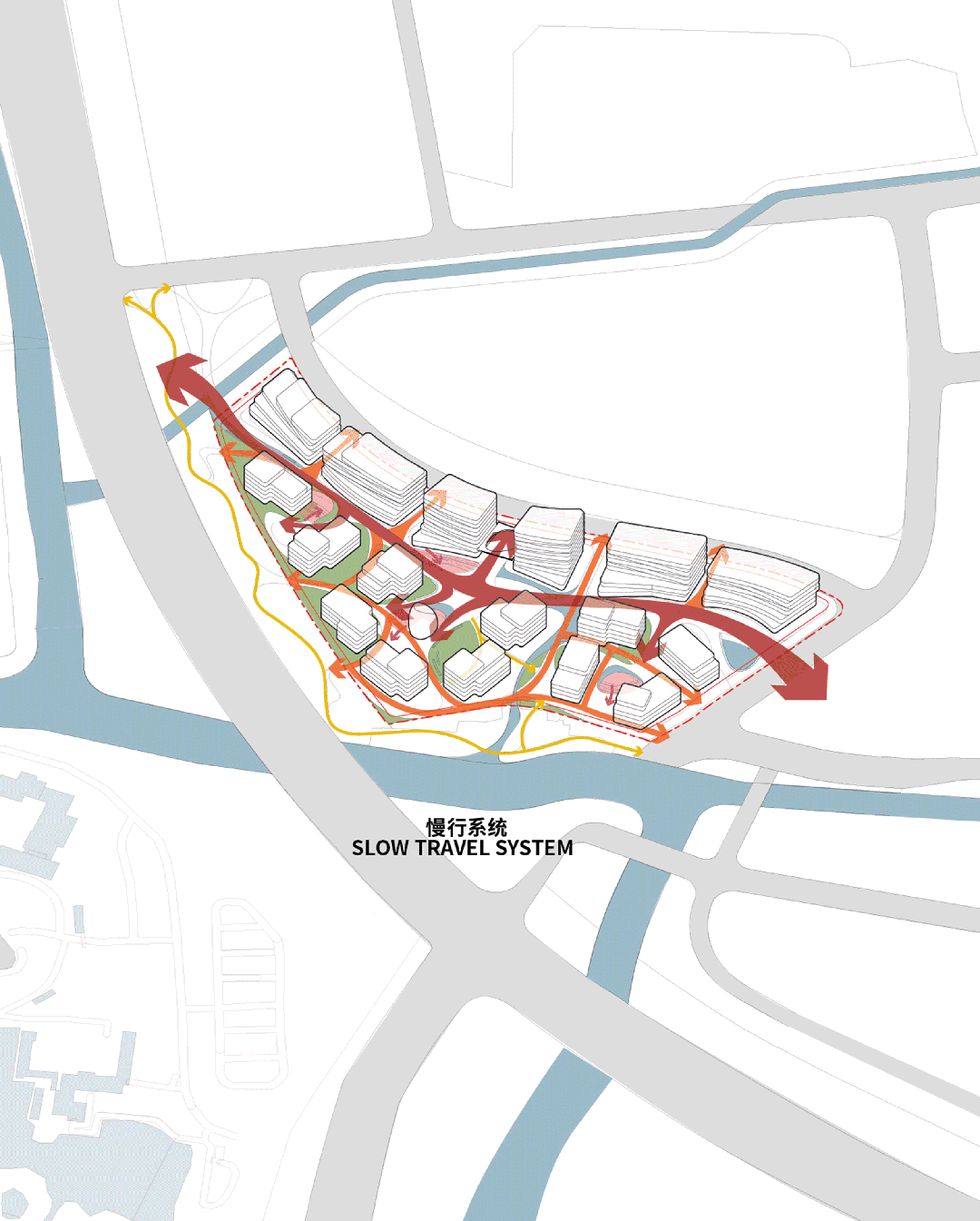 The project features a north–south landscape corridor linking the historic district to the Xixi Wetland, while western water systems and greenery create a blue–green park setting. Along these landscape axes, building clusters emerge naturally, fostering an environment where architecture is seamlessly embraced by nature.